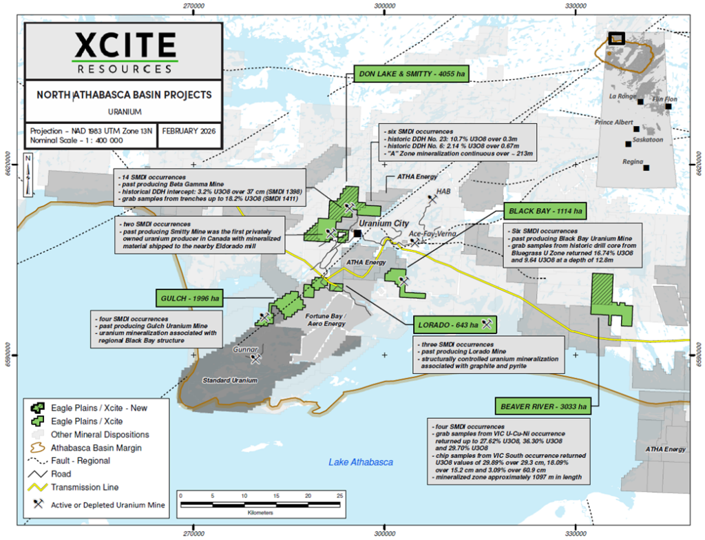 Vancouver, British Columbia, February 19th, 2026: Xcite Resources Inc. (CSE:XRI) (“XRI”, “Xcite”or the “Company”), is please to announce, the inclusion of seven dispositions recently acquired by staking in the Uranium City area, northern Saskatchewan by Eagle Plain. The dispositions fall within an Area of Mutual Interest (“AMI”) and as such, will become included in the Don Lake, Smitty and Beaver River projects respectively. The Don Lake – Smitty projects are now contiguous with an additional 2649ha of claims bringing the total area to 4055ha. The Beaver River project has added 1578ha, for a total of 3033ha.